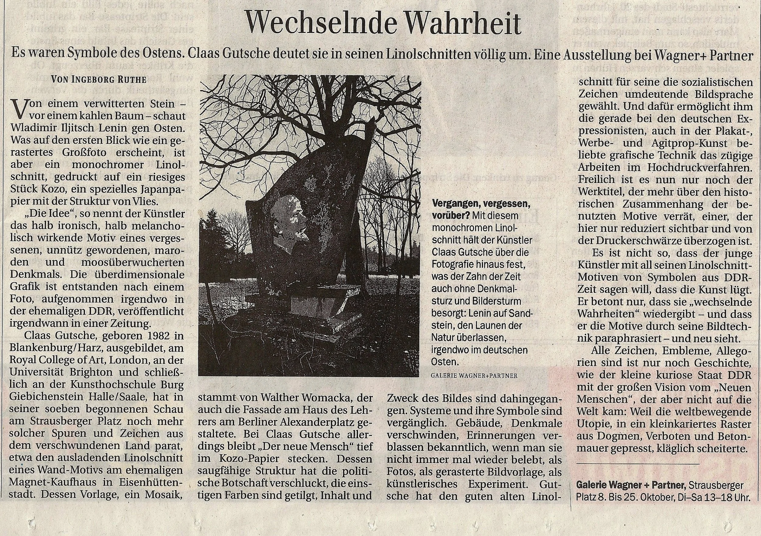 Der in Berlin lebende, in Ostdeutschland geborene Druckgrafiker Claas Gutsche beschäftigt sich in seinen groß- und kleinformatigen Linolschnitten auf feinem Japanpapier unter anderem mit den Spuren der deutsch-deutschen Vergangenheit und damit im weiteren Sinne mit den Themen kollektives Gedächtnis und Erinnerungskultur. Aufgewachsen in Blankenburg im Harz erlebte er im Alter von 7 Jahren die Wende und lernte so sowohl noch Ost- als auch Gesamtdeutschland kennen. Seine Grafik zeigt oft stimmungsschwangere Orte, deren geschichtsträchtige Bedeutung sich dem Betrachter erst mit zusätzlicher Information, etwa durch den Bildtitel, erschließt. Assoziationen an die NS-Zeit, die Deutsche Demokratische Republik oder jüngste beunruhigende Nachrichtenmeldungen erwachen im Betrachter. Die technisch versiert ausgeführten Blätter werden monochrom oder mehrfarbig gedruckt, es entstehen auch Reduktionsschnitte.